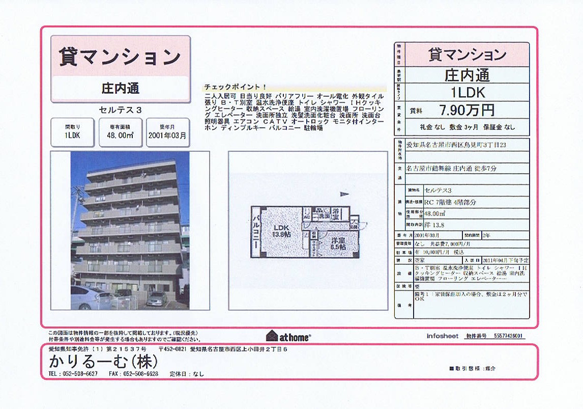 «貸マンション 1LDK 愛知県名古屋市西区鳥見町 地下鉄鶴舞線庄内通駅徒歩7分 使用部分面積48平米 築2001年 賃料7.9万円 共益費7000円 駐車場10000円 敷金3ヶ月(家賃保証加入の場合2ヶ月)