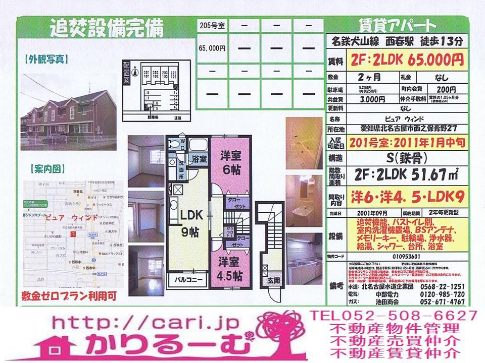 賃貸アパート 名鉄犬山線西春駅徒歩13分 2LDK 65000円 敷金2ヶ月 駐車場5250円 共益費3000円 愛知県北名古屋市西之保青野 構造:S(鉄骨) 51.67平米 完成2001年 物件コード:010953601K