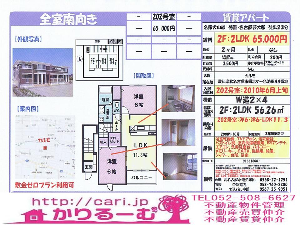賃貸アパート 2LDK65000円 W造 56.26平米 愛知県北名古屋市鍛冶ヶ一色池田 名古屋芸大駅徒歩23分築年月2008