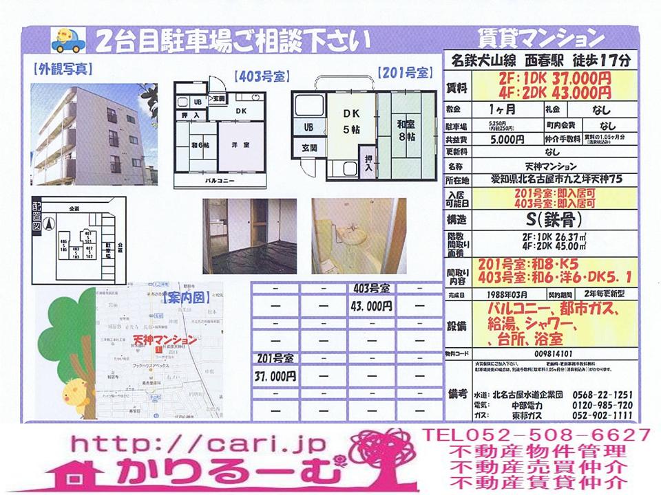 賃貸マンション 1DK37000円 2DK43000円 S造 26.37平米 45.00平米 愛知県名古屋市九之坪天神 西春駅徒歩17分築年月1988年
