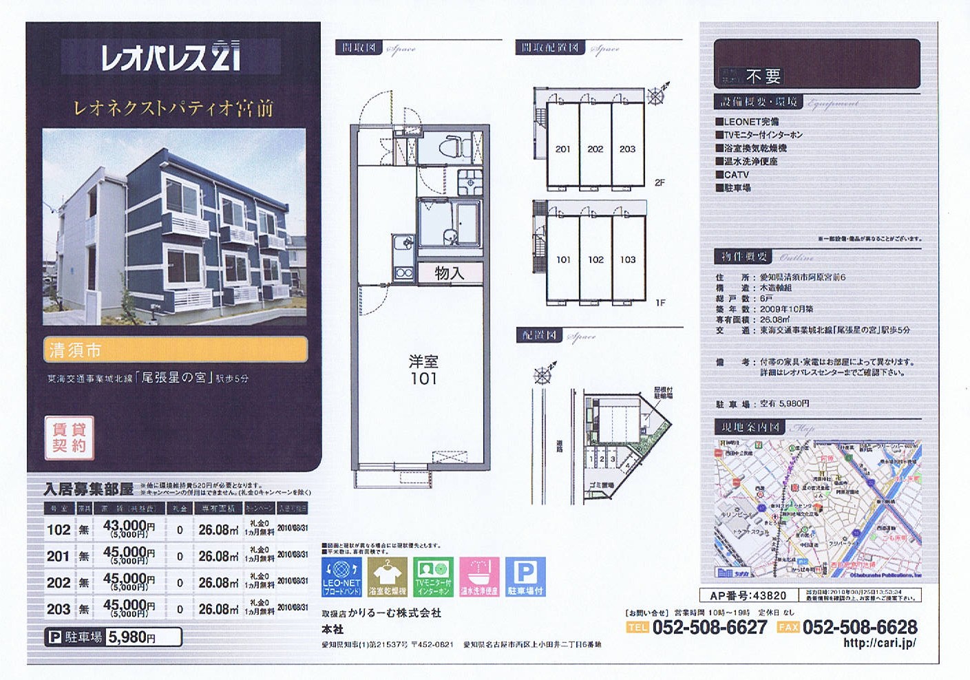 賃貸物件 1K 43000円~45000円 愛知県清須市阿原宮前 尾張星の宮駅徒歩5分