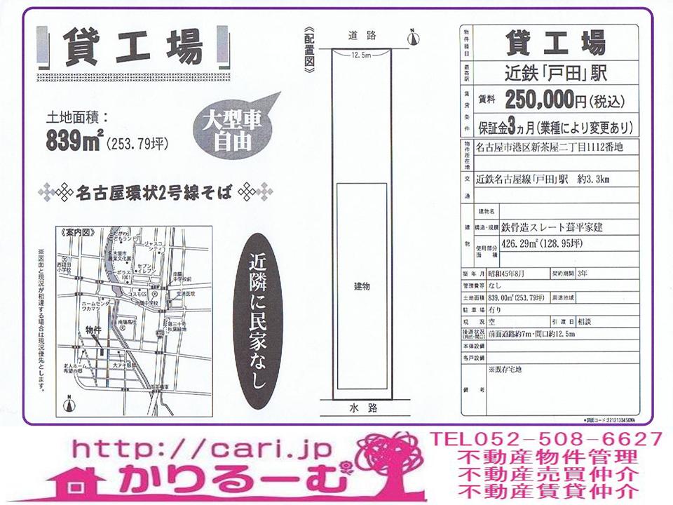 貸工場 土地面積:839平米(253.79坪) 賃料25万円(税込) 保証金3ヵ月 愛知県名古屋市港区新茶屋二丁目 近鉄名古屋線戸田駅約3.3km 鉄骨造スレート葺平屋建 使用部分面積:426.29平米(128.95坪) 築昭和45年 駐車場有 物件番号:70520456K
