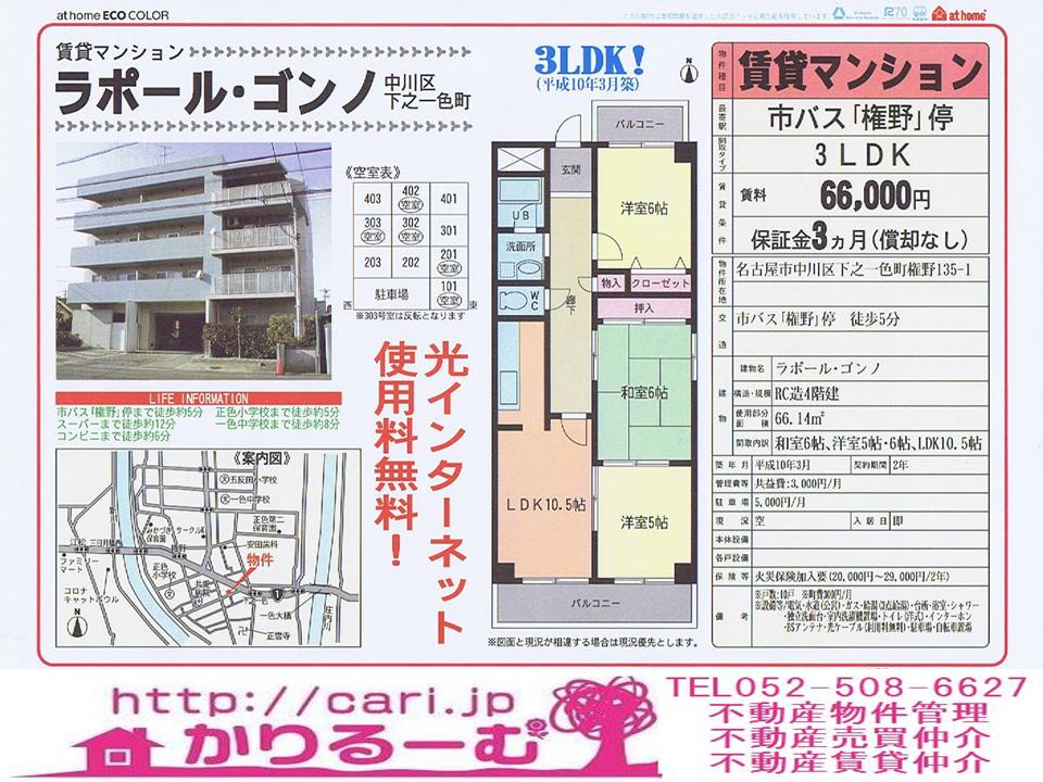 賃貸マンション 3LDK 愛知県名古屋市中川区下之一色町権野 市バス権野停徒歩5分 RC造 使用部分面積66.14平米 築平成10年 賃料66,000円 共益費:月3,000円 駐車場:月5,000円 保証金3ヵ月(償却なし) 物件番号70630369-1K