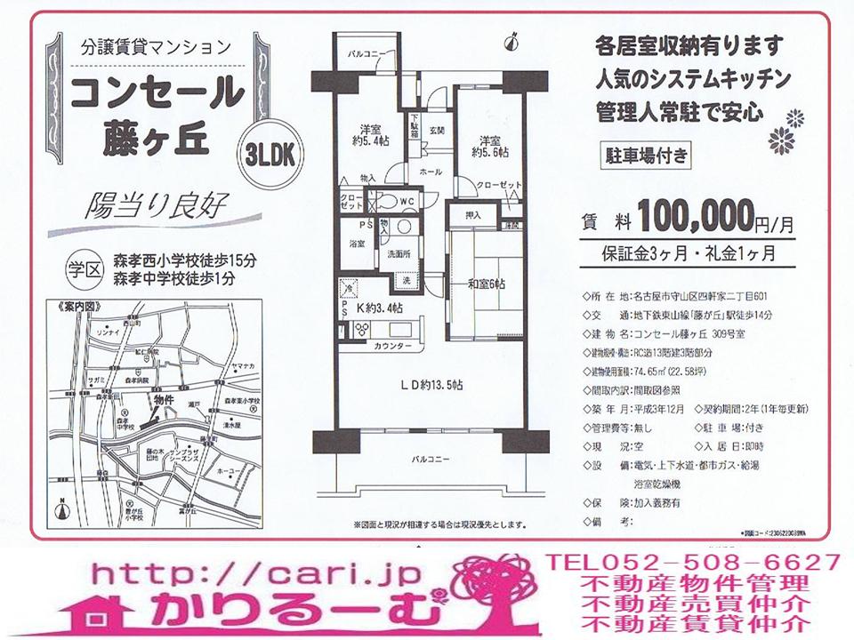 分譲賃貸マンション 3LDK 100,000円 名古屋市守山区四軒家二丁目 地下鉄東山線「藤が丘」駅徒歩14分 [74670089-1]M