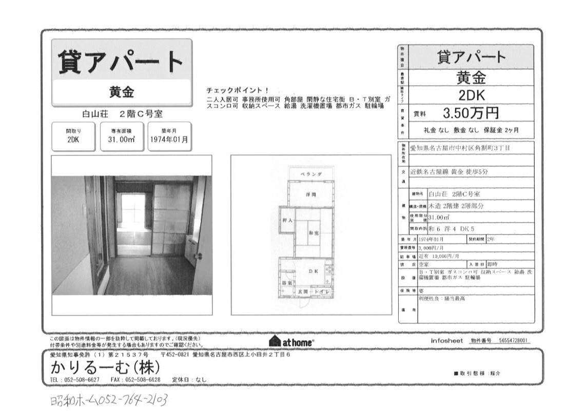 貸アパート 2DK 愛知県名古屋市中村区角割町 近鉄名古屋線黄金徒歩5分 保証金2ヶ月 賃料3.5万円 管理費3千円 物件番号56554728001 [ささしまライブ近め]