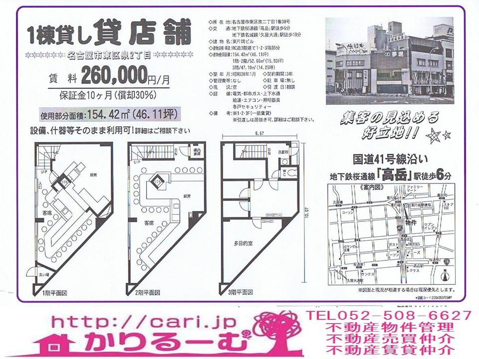 1棟貸し貸店舗 260,000円 名古屋市東区泉二丁目 地下鉄桜通線高岳駅徒歩6分 地下鉄名城線久屋大通駅徒歩10分 [74510857]M